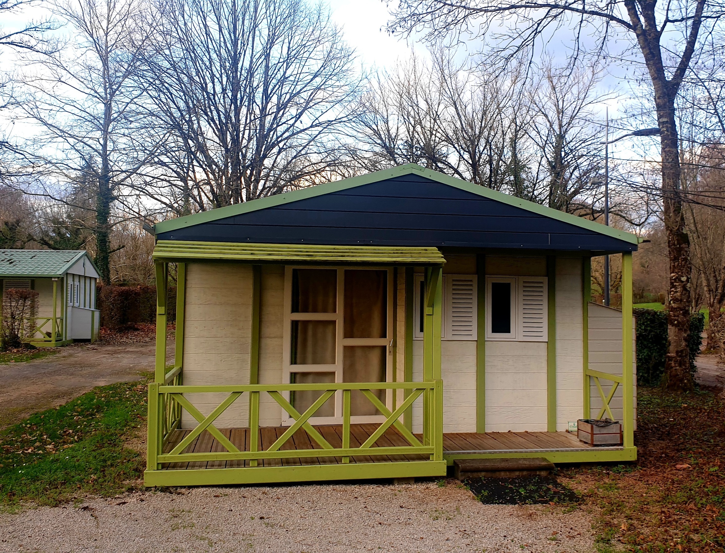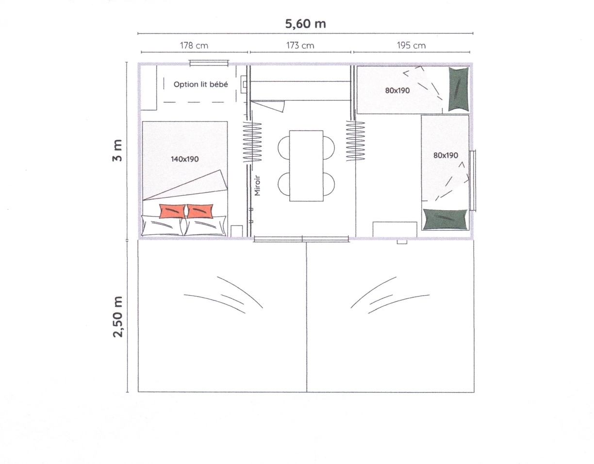 « COCO c’est un mobil-home à la forme ronde recouvert d’une toile. Ses murs sont rigides et isolés, sa porte d’entrée ferme à clef. Il peut recevoir 4 personnes avec ses 2 chambres équipées de sommiers avec matelas. Il n’offre pas de sanitaire mais une kitchenette équipée d’un four micro-ondes et d’un frigo »