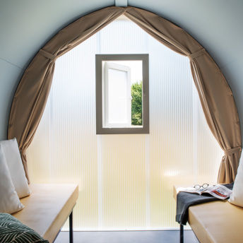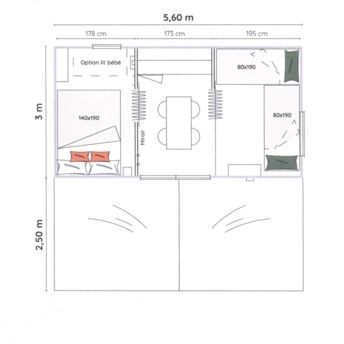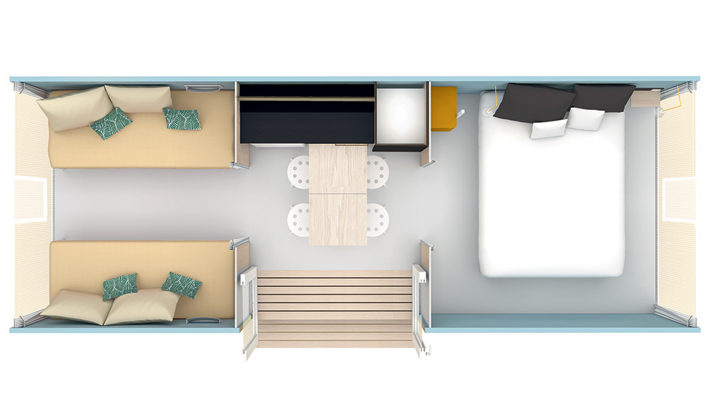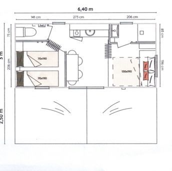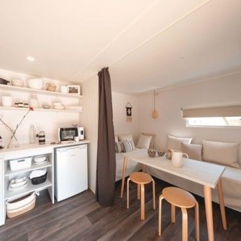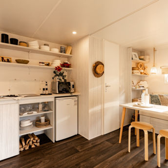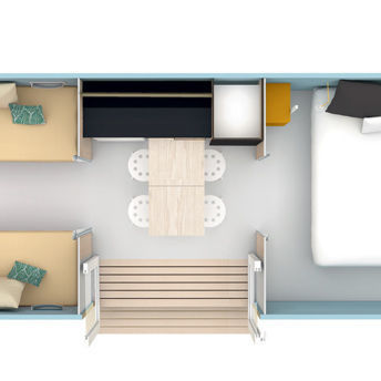 « C’est un mobil-home recouvert d’une toile. Ses murs sont rigides et isolés, sa porte d’entrée ferme à clef. Il peut recevoir 4 personnes avec ses 2 chambres équipées de sommiers avec matelas. Elles sont toutes équipées d'une kitchenette avec un four micro-ondes, plaque de cuisson et d’un frigo. Certaines ont une salle d'eau avec toilettes séparés ».